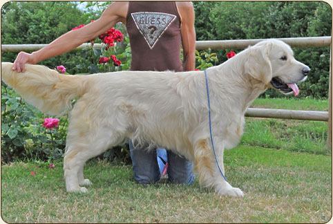 Fille de Blue of Sim x Tweednous Ghost, Miss Goldie of Sim impressionne par sa construction. Excellentes avant main et arrière main, une ligne de dos droite et solide, une poitrine bien descendue sous le coude, son mouvement est gracieux et emmené, sa tête est typique avec de belles expressions et sa sortie d'encolure est plutôt avantageuse, ses oreilles sont très bien placées et sa pigmentation est excellente. Miss Goldie est un beau modèle de golden retriever particulièrement équilibré. |