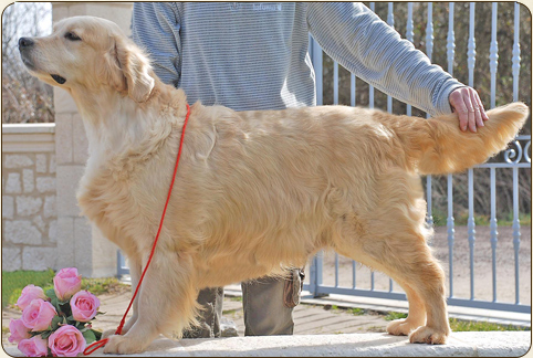 Son surnon est protection. De nature calme Derby est très protectrice de son environnement et des enfants. Elle aime se reposer près de la maternité assurant une garde paisible mais vigilante. Derby est admirée autant par sa construction que par sa féminité, elle est très bien proportionnée sur une solide ossature, de bonnes épaules, avant main et arrière main et une ligne de os bien droite, ce qui lui a valu de remporter plusieurs 1 prix d'excellence en Europe. |